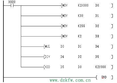 案例二: 某控制程序中要进行以下算式的运算:38X/255+2 式中“ X ”代表输入端口 K2X0 送入的二进制数,运算结果需送输出口 K2Y0 ; X020 为起停开关。