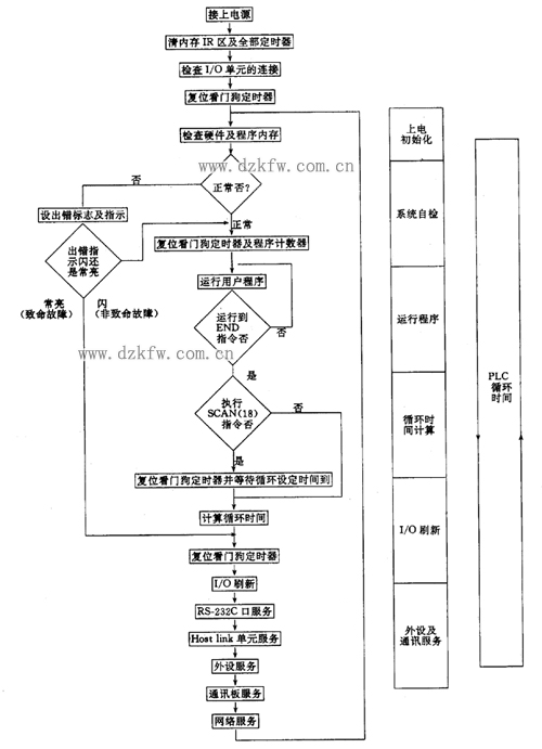 有了上述过程,用PLC实现控制显然是可能的。因为:有了输入刷新,可把输入电路监控得到的输入信息存入PLC的输入映射区;经运行用户程序,输出映射区将得到变换后的信息;再经输出刷新,输出锁存器将反映输出映射区的状态,并通过输出电路产生相应的输出。又由于这个过程是永不停止地循环反复地进行着,所以,输出总是反映输入的变化的。只是响应的时间上,略有滞后。当然,这个滞后不宜太大,否则,所实现的控制不那么及时,也就失去控制的意义。