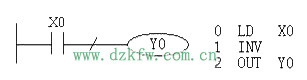 (1)INV(反指令) 执行该指令后将原来的运算结果取反。反指令的使用如图10所示,如果X0断开,则Y0为ON,否则Y0为OFF。使用时应注意INV不能象指令表的LD、LDI、LDP、LDF那样与母线连接,也不能象指令表中的OR、ORI、ORP、ORF指令那样单独使用。