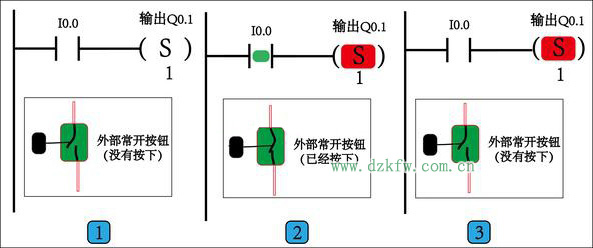 如图3,这个是PLC置位复位程序的置位执行步骤,1,外部常开按钮没有按下时I0.0没有接通,Q0.1置位线圈就没有输出。2,外部常开按钮按下时I0.0接通,Q0.1置位线圈就有了输出。3,松开外部常开按钮时I0.0断开没有接通,虽然I0.0已经断开没有了接通,但Q0.1置位线圈依然还是有输出,实现了自锁功能。直到有复位信号时它才会没有输出,这就是置位操作指令的特点。简单不。接下来看复位的操作。