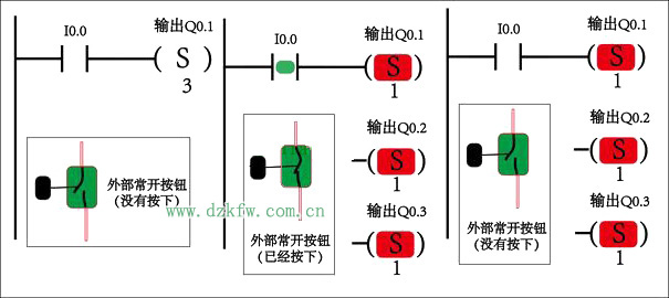 如图5,这张图说明了PLC置位和复位操作指令的,一次性操作多个输出位的使用方法,当置位或复位操作指令的下面的数字是3时,就表示当外部常开按钮按下时,可以一次性置位3个输出点,并一直保持,直到有复位信号产生。以上就是PLC置位和复位操作指令的基本的使用方法,大家可以配合我们上节讲的西门子s7200 PLC的仿真软件,进行仿真调试,然后熟练掌握这两个操作指令。