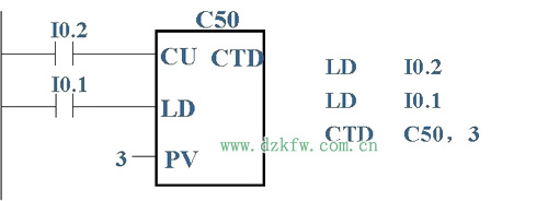 使该计数器在CD输入的上升沿从预置值开始递减计数。当当前计数值(C×××)等于0时,该计数器被置位。当装载输入(LD)接通时,计数器复位并把预设值(PV)装载当前值。