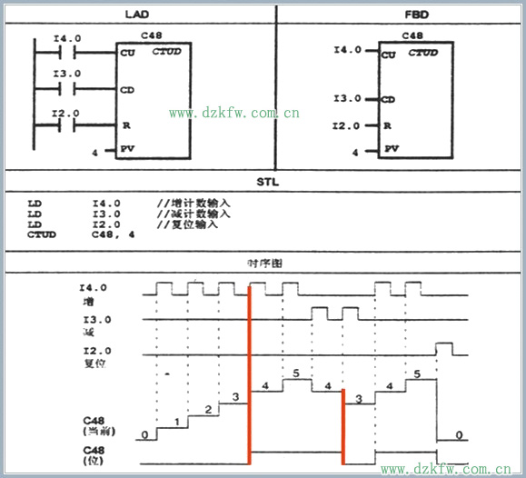 使该计数器在每CU输入的上升沿,从当前计数值开始递增计数,在每一个CD输入的上升沿,递减计数。当复位输入(R)置位时,计数器被复位。