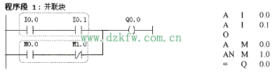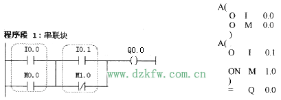 与西门子S7-200 plc不同,S7-300/400 PLC的电路块没有专用的指令。如图1所示的并联块,实际就是把两个虚线框当做两个块,再将两个块做或运算。如图2所示的串联块,实际就是把两个虚线框当做两个块,再将两个块做与运算。