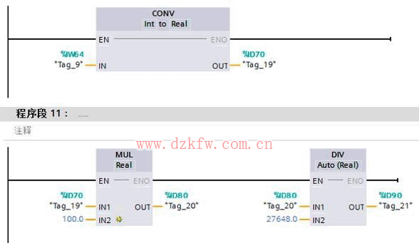 因为公式中IW64乘以100的运算结果可能会大于16位整数的最大值32767(IW64为16位存储器,模拟值为二进制的补码,最高位为符号位,0为负,1为正),因此应将IW64中的数值数据类型转换为实数再进行乘除运算。