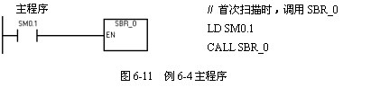 如图6-11所示,用首次扫描时接通一个扫描周期的特殊内部存储器SM0.1去调用一个子程序,完成初始化操作。