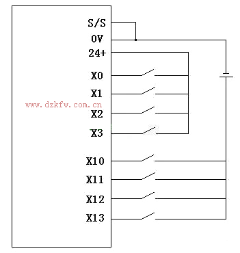 【8】在FX3U PLC的输入端口接入无源开关,XO—X3使用内置24V电源,而在X10—X13使用外置电源?应如何接线?