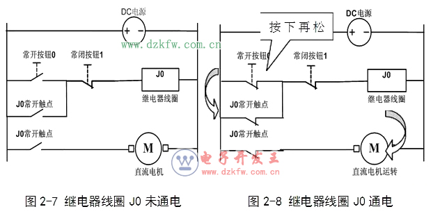 开机 = 按下常开按钮0 → 继电器线圈J0得电 → J0常开主触点闭合 → 电机得电开机、同时J0常开辅助触点自锁 → 电机继续运行,如图2-8。
