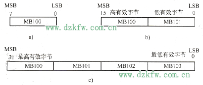 两个字(或4个字节)组成1个双字,双字用来表示无符号数。双字MD100由MB100~MB103组成(见图3-6),D表示双字,100为双字的起始字节MB100的编号。MB100是双字MD100中的最高位字节。双字的的取值范围为DW#16#0000 _ 0000 ~ DW#16#FFFF _ FFFF。