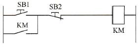这样当常闭按钮SB2闭合时,常开触点00401一直闭合,当SB1按钮接通时,00400触点接通,线圈00300得电,KM得电,电机运行;当SB2按钮断开时,00401触点断开,线圈00300失电,KM失电,电机停止运行。