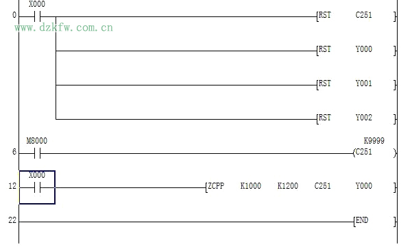 自动剪板机。plc的Y0 Y1 Y2分别与变频器的高速、低速、制动端子相连,当按下启动按钮X000时,电机开始送料,同时计数开始(转数)。电机高速运行,若计数器的设定值为1000、1200,则当计数器K值满足1000<K<1200时,电机低速运行;当计数器K值满足K>1200时,电机制动。剪刀动作开始。
