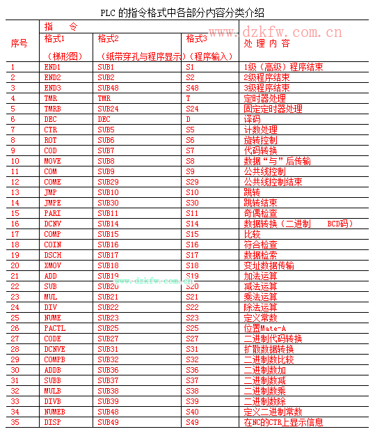 指令的三种格式,格式1用于梯形图;格式2用于纸带穿孔和程序显示;格式3是用编程器输入程序时的简化指令。对TMR和DEC指令在编程器上有其专用指令键,其他功能指令则用SUB键和其后的数字键输入。