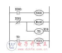 0 LD X000 1 OUT Y000 2 LDI X001 3 OUT M100 4 OUT T0 K19 ——程序步自动管理空2步 7 LD T0 8 OUT Y001