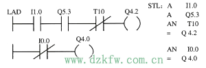 如图所示,触点串联指令也用于串联逻辑行的开始。CPU对逻辑行开始第1条语句如Il.0的扫描称为首次扫描。首次扫描的结果(I1.0的状态)被直接保存在RLO(逻辑操作结果位)中;在下一条语句,扫描触点Q5.3的状态,并将这次扫描的结果和RLO中保存的上一次结果相“与”产生的结果,再存入RLO中,如此依次进行。在逻辑串结束处的RLO可作进一步处理。如赋值给Q4.2 (=Q4.2)。