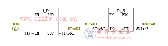 plc在处理模拟量时,其输入和输出大多是整数,用浮点数来处理这些数据时要进行整数和浮点数之间的相互转换。例如图6所示,现场采集的数据为16位的整型数("#IN"),PLC在做控制前,要先将其转换为浮点数("#DItoR")。由于整型数占16位,而浮点数占32位,二者不能直接转换。要先将整型数转换为双整型("#ItoDI"),然后再转换为浮点型。