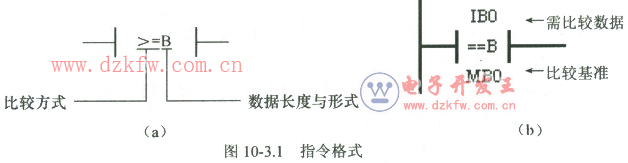 ①比较指令在S7-200中以“功能触点”的形式使用,如图10-3.1 (a)所示。梯形图中的表达形式如图10-3.1 (b)所示,需要比较的两个操作数分别位于功能触点的上部与下部,其中上部为需要比较的数据,下部为比较基准数据。