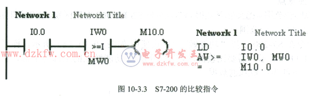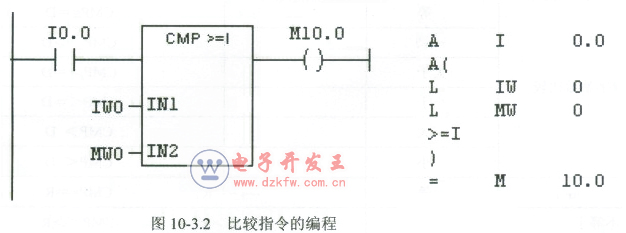 图10-3.2中“CMP”为比较标记,“>=”为执行的比较操作,在S7-300/400中允许的比较操作与S7-200相同。