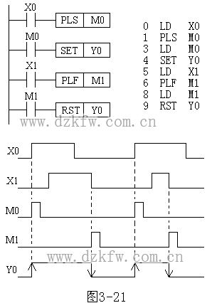 2)使用PLS时,仅在驱动输入为ON后的一个扫描周期内目标元件ON,如图3-21所示,M0仅在X0的常开触点由断到通时的一个扫描周期内为ON;使用PLF指令时只是利用输入信号的下降沿驱动,其它与PLS相同。