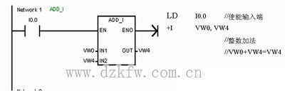 +I,整数加法指令。使能输入有效时,将两个单字长(16位)的符号整数IN1和IN2相加,产生一个16位整数结果OUT。
