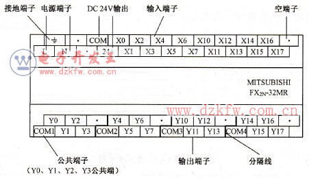 FX2N-32MR PLC的接线端子排列如图1-5所示。L、N端是电源的输入端,一般直接使用工频交流电AC (100~250V),L端为交流电源相线,N为交流电源的中性线。机内自带直流24V内部电源,为输入器件和扩展单元供电。X0~X17为输入端子,COM为输入端子的公共端。Y0~Y17为输出端子,COM1~COM4为输出端子的公共端。FX2N-32MR的输入端子只有一个公共端子COM,而输出端子的公共端共有4个(COM1~COM4),其中Y0、Y1、Y2、Y3的公共端子为COM1,Y4、Y5、Y6、Y7的公共端子为COM2,中间用颜色较深的分隔线分开,其他公共端同理。其他型号的接线端子排列与此相类似,可参考相关资料进一步确定。