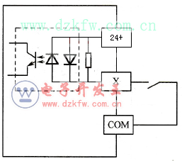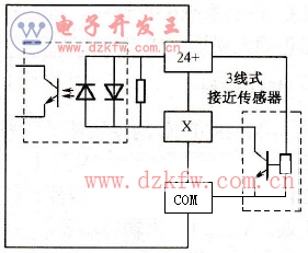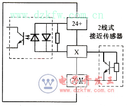 漏型输入和源型输入是针对直流输入而言的,对于FX2N系列PLC来说,DC电流从PLC公共端(COM端)流入,而从输入端流出,称为漏型输入。而源型输入电路的电流是从PLC的输入端流入,从公共端流出。三菱公司在中国销售的FX2N系列PLC只有漏型输入的型号。当输入是无电压触点输入时,如图1-6所示,电流经24+端子输出,经内部电路、X输入端子和外部的触点,从COM端子流回24V电源的负极。当输入是2线式接近传感器时,接线如图1-7所示,2线式接近传感器为NPN型。当输入是3线式接近传感器时,接线如图1-8所示,3线式接近传感器也是NPN型。