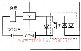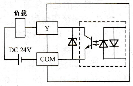FX2N系列的PLC输出有漏型输出和源型输出两种类型,漏型输出是指负载电流流入输出端子,而从公共端子流出。源型输出是指负载电流从输出端子流出,而从公共端子流入。漏型输出如图1-9所示,当输出继电器Y为ON时,电流从Y端流入,从公共端COM流出。源型输出如图1-10所示,当梯形图中的输出继电器Y为ON时,电流从公共端COM流入,从Y端流出。