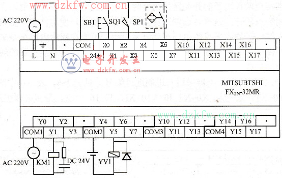 图1-11中FX2N-32MR型PLC为AC电源,DC输入。L、N端接AC 220V电源,X0输入点接SB1按钮,X2输入点接SQ1限位开关,X6输入点接NPN型三线制接近开关。在输出点中,Y1接一个220V的交流接触器KM1,Y5接一个电磁阀YV1。