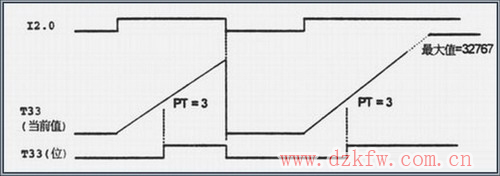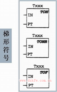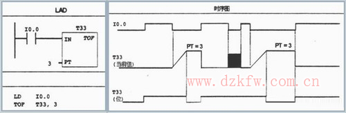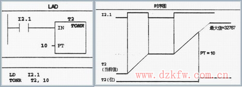 当使能输入接通时,接通延时定时器和有记忆接通延时定时器开始计时,当定时器的当前值(Txxx)大于等于预设值时,该定时器位被置位。当使能输入断开时,清除接通延时定时器的当前值,而对于有记忆接通延时定时器,其当前值保持不变。可以用有记忆接通延时定时器累计输入信号的接通时间,利用复位指令(R)清除其当前值。