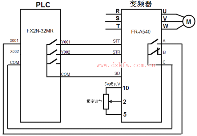 PLC控制变频器驱动电动机正反转的电路、程序及参数设置