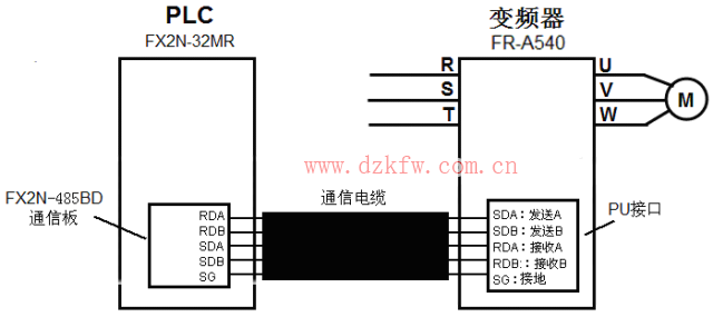 三菱FX PLC一般不带RS485通信口,如果要与变频器进行RS485通信,须给PLC安装FX2N-485BD通信板。485BD通信板的外形和端子如下图(a)所示,通信板的安装方法如下图(b)所示。