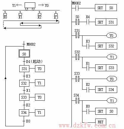 假设小车位于原点(最左端),系统处于初始步,S0为“1”状态。按下起动按钮X4,系统由初始步S0转换到步S31。S31的STL触点接通,Y0的线圈“通电”,小车右行,行至最右端时,限位开关X3接通,使S32置位,S31被系统程序自动置为“0”状态,小车变为左行,小车将这样一步一步地顺序工作下去,最后返回起始点,并停留在初始步。图6中的梯形图对应的指令表程序如表所示.。