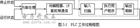 可编程控制器的工作过程包括两部分:自诊断及通信响应的固定过程和用户程序执行过程,如图5-1所示。PLC在每次执行用户程序之前,都先执行故障自诊断程序、复位、监视、定时等内部固定程序,若自诊断正常,继续向下扫描,然后PLC检查是否有与编程器、计算机等的通信请求。如果有与计算机等的通信请求,则进行相应处理。当PLC处于停止(STOP)状态时,只循环进行前两个过程。而在PLC处于运行(RUN)状态时,PLC从内部处理、通信操作、输入扫描、执行用户程序、输出刷新五个工作阶段循环工作。每完成一次以上五个阶段所需要的时间称为一个扫描周期。