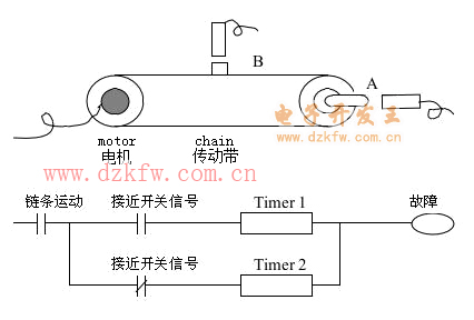 链条传动监测一般采用接近开关,如图A处(感应块在轴上),或B处(感应块在链条上)。这样的情况属于断续输入,即链条运转时,接近开关输入既不能始终为0,也不能始终为1。