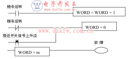 由于每个扫描周期不尽相等,(它因程序执行而每个周期都在波动,略有差别),所以这样的定时器方法并不精确,在前面所述的实现工艺要求延时等场合不宜使用,但在其它许多场合则很实用。例如这个链条监控的程序,用一个WORD变量就够了。而字变量相对多得多,可以说大大扩充了定时器的数量。