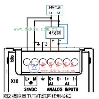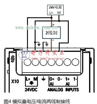 两线制仪表指的是传感器仪表只有两根线,电源与信号公用,而对于s7-200 smart的模拟量扩展模块的输入通道,是没有DC24V输出的,所以需要将一个DC24V串入到传感器仪表中。如图四