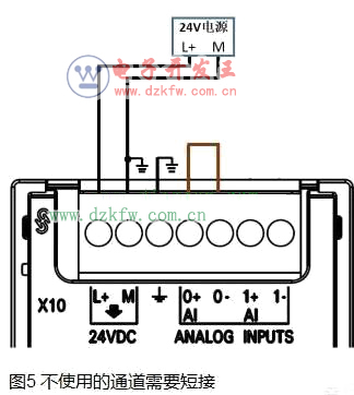 而对于在系统中不使用的模拟量通道,我们需要用短接线进行短接,如若不短接,在运行中,系统会报错误。如图五