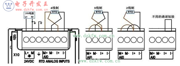 RTD热电阻模块的接线也分四线、三线、两线,其中四线制仪表的精度最高,接线图如下: