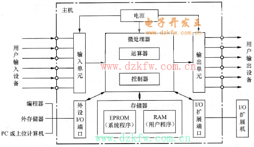 由PLC的定义可知,PLC也是一种计算机,它有着与计算机相类似的结构,PLC的硬件主要由中央处理器( CPU)、存储器(memory)、输入/输出(I/O)单元、通信接口、扩展接口、电源等几部分组成。硬件组成结构如图1-4所示。