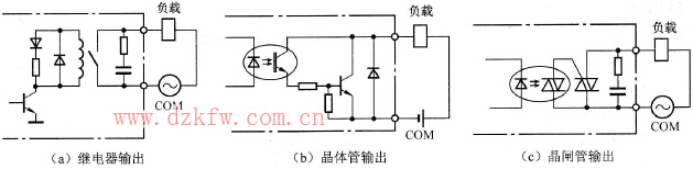 PLC的输出有3种形式:继电器输出、晶体管输出和晶闸管输出。图1-6给出了PLC的3种输出接口电路。