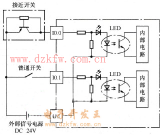 PLC的输入接口电路中有光耦合隔离,并设有RC滤波器,用以消除输入触点的抖动和外部噪声的干扰。当开关闭合时,一次电路中有电流流过,输入指示灯亮,光耦合器被激励,三极管由截止状态变为饱和导通状态,一个外部信号送到PLC的内部电路中。图1-5是一个直流输入接口电路的原理图。