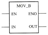 数据处理指令的梯形图格式主要以指令盒的形式表示,如图所示。指令盒顶部为该指令的标题,如图中所示MOV_B。标题一般由两部分组成,前部分为指令的助记符,多为英文单词的缩写.本例中MOV表示数据内容的传送;后部分为参与运算的数据类型,B表示字节,常见的数据类型还有W(字)、DW(双字)、R(实数)、I(整数)、DI(双整数)等。