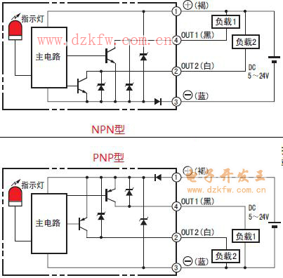 NPN型传感器与PNP型传感器的输出接线图