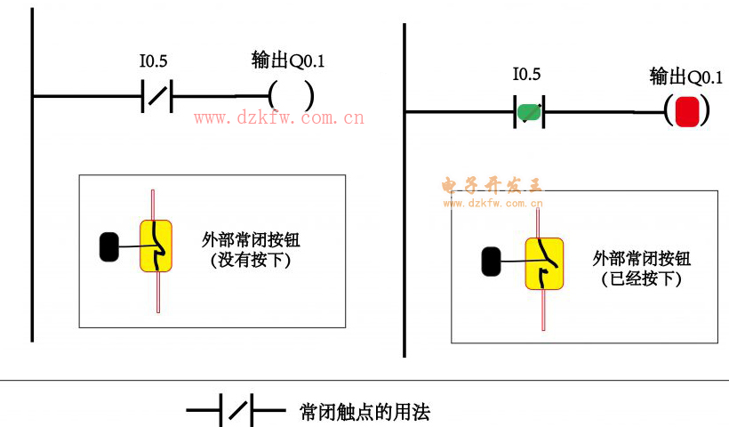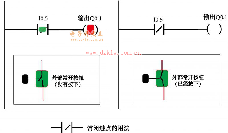 图4,是程序内常闭触点的另一种用法,如果外部接的是常闭按钮,当没有按下时,I0.5是不通的,所以Q0.1就没有有输出。如果外部常闭按钮按下,Q0.1就有输出,因为I0.5通了。这个也有点难度。但是我告诉大家一句话基本上你就能明白的差不多了,程序内的常开触点,给它信号它就接通。常闭触点,给它信号它就断开。这个信号就是我们外部的常开或常闭按钮。要还不明白,死记硬背吧,要是能记住也是可以编程的。