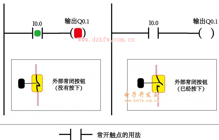 图2,是程序内常开触点的另一种用法,如果外部接的是常闭按钮,同样能实现控制Q0.1的输出。当外部常闭按钮没有按下时,I0.0就是通的,所以Q0.1就有输出。如果外部常闭按钮按下,Q0.1就没有有输出,因为I0.0不通了(PLC程序内,绿色的为接通,红色的为有输出)。这个理解起来还可以哈。