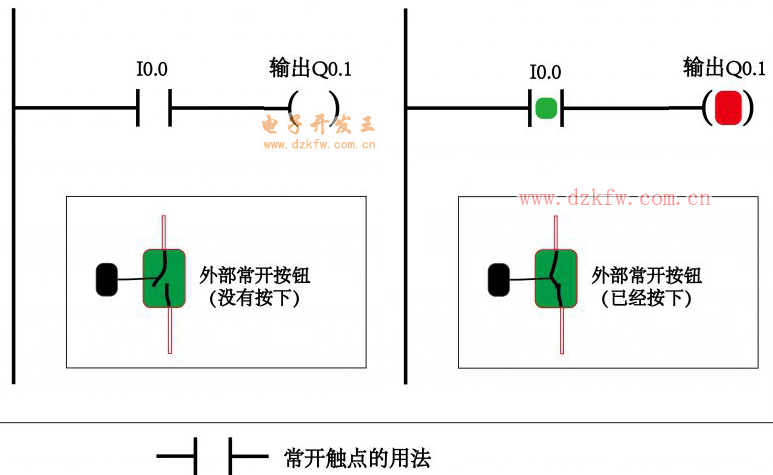 如图1,是PLC程序内常开触点的用法(大家注意我说的常开触点是PLC程序内的,不是外部的常开按钮,大家别弄混了),如果外部常开按钮没有按下,Q0.1就没有输出,因为I0.0没有接通。如果外部常开按钮按下,Q0.1就有输出,因为I0.0接通了(PLC程序内,绿色的为接通,红色的为有输出)。这个最好理解。