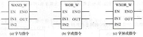 (2)功能:当使能输入(EN)有效时,字与指令(ANDW)、字或指令(ORW)和字异或指令(XORW)分别对两个字按位进行与、或和异或运算,得到一个字结果并存放在OUT中。