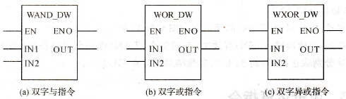 (2)功能:当使能输入(EN)有效时,双字与指令(ANDD)、双字或指令(ORD)和双字异或指令(XORD)分别对两个双字按位进行与、或、异或运算,得到一个双字结果并存放在OUT中。
