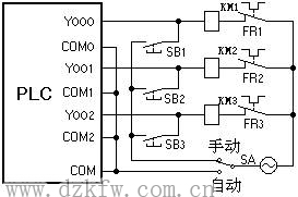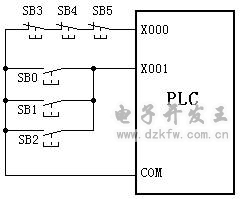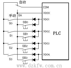 (1)分组输入  如图1所示,系统有“手动”和“自动”两种工作方式。用X000来识别使用“自动”还是“手动”操作信号,“手动”时的输入信号为SB0~SB3,“自动”时的输入信号为S0~S3,如果按正常的设计思路,那么需要X000~X007一共8个输入点,若按图1的方法来设计,则只需X001~X004一共4个输入点。图中的二极管用来切断寄生电路。如果图中没有二极管,系统处于自动状态,SB0、SB1、S0闭合S1断开,这时电流从COM端子流出,经SB0、SB1、S0形成寄生回路流入X000端子,使输入位X002错误地变为ON。各开关串联了二极管后,切断了寄生回路,避免了错误的产生。但使用该方法应考虑输入信号强弱。