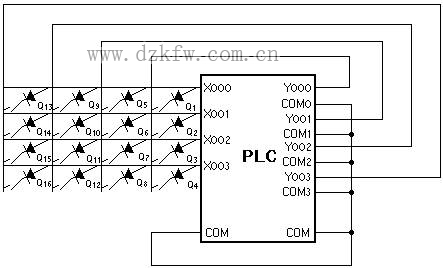 (2)矩阵输入  如图2所示为4×4矩阵输入电路,它使用PLC的四个输入点(X000~X003)和四个输出点(Y000~Y003)来实现16个输入点的功能,特别适合PLC输出点多而输入点不够的场合。当Y000导通时,X000~X003接受的是Q1~Q4送来的输入信号;当Y001导通时,X000~X003接受的是Q5~Q8送来的输入信号;当Y002导通时,X000~X003接受的是Q9~Q12送来的输入信号;当Y003 导通时,X000~X003接受的是Q13~Q16送来的输入信号。将Y000的常开点与X000~X003串联即为输入信号Q1~Q4;将Y1的常开点与X000~X003串联即为输入信号Q5~Q8;将Y002的常开点与X000~X003串联即为输入信号Q9~Q12;将Y003的常开点与X000~X003串联即为输入信号Q13~Q16。