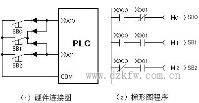 (3)组合输入  对于不会同时接通的输入信号,可采用组合编码的方式输入。如图3所示,三个输入信号SB0~SB2只占用两个输入点,M0~M2图3  组合输入